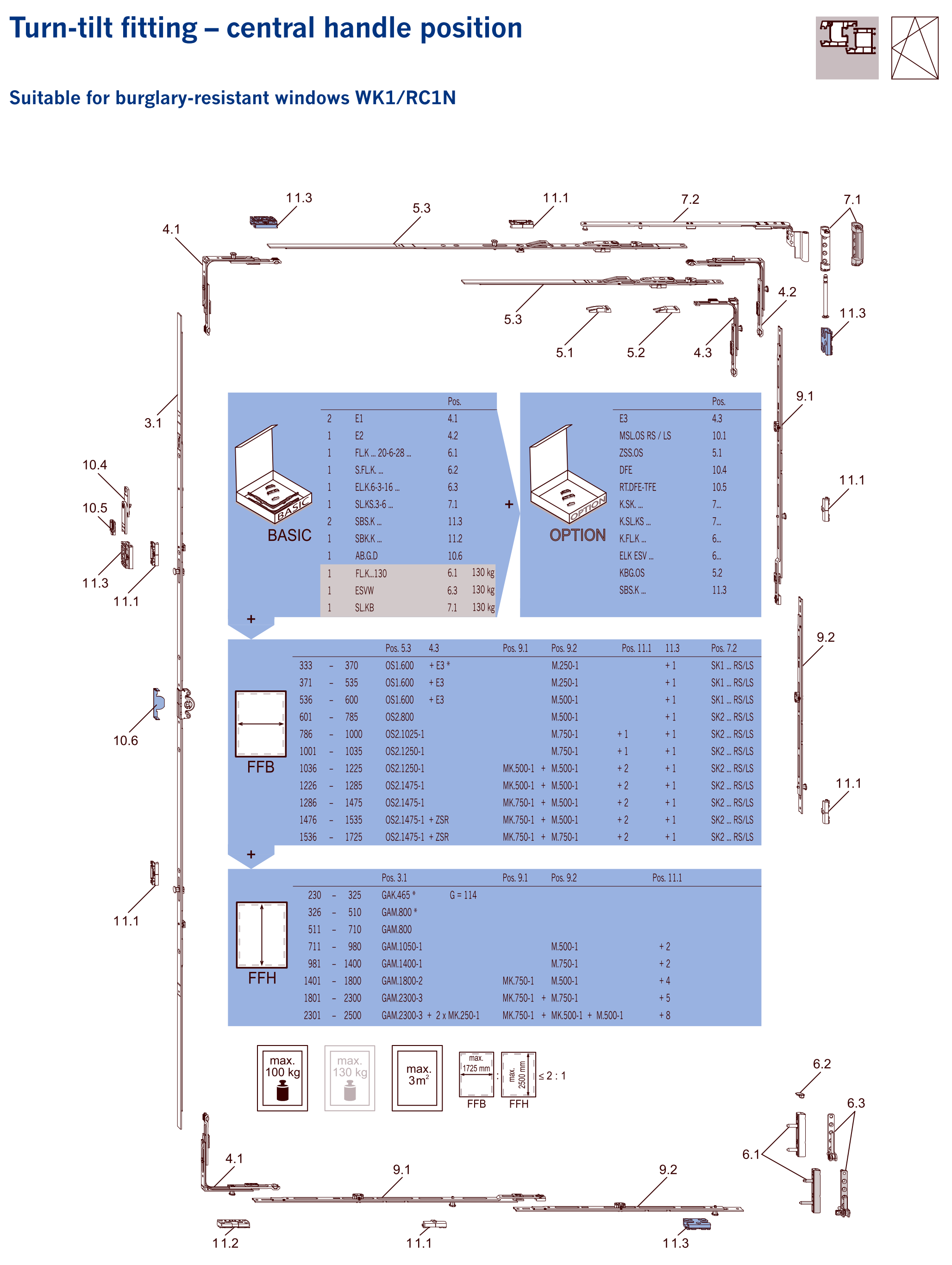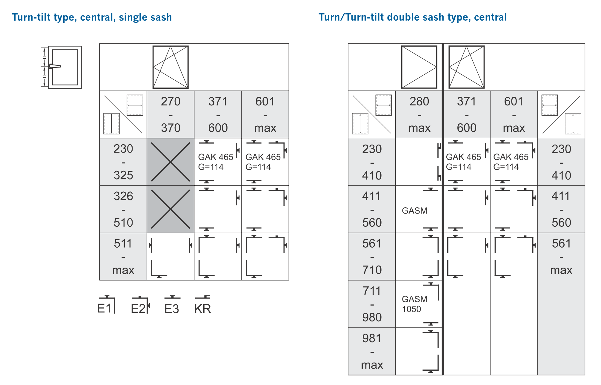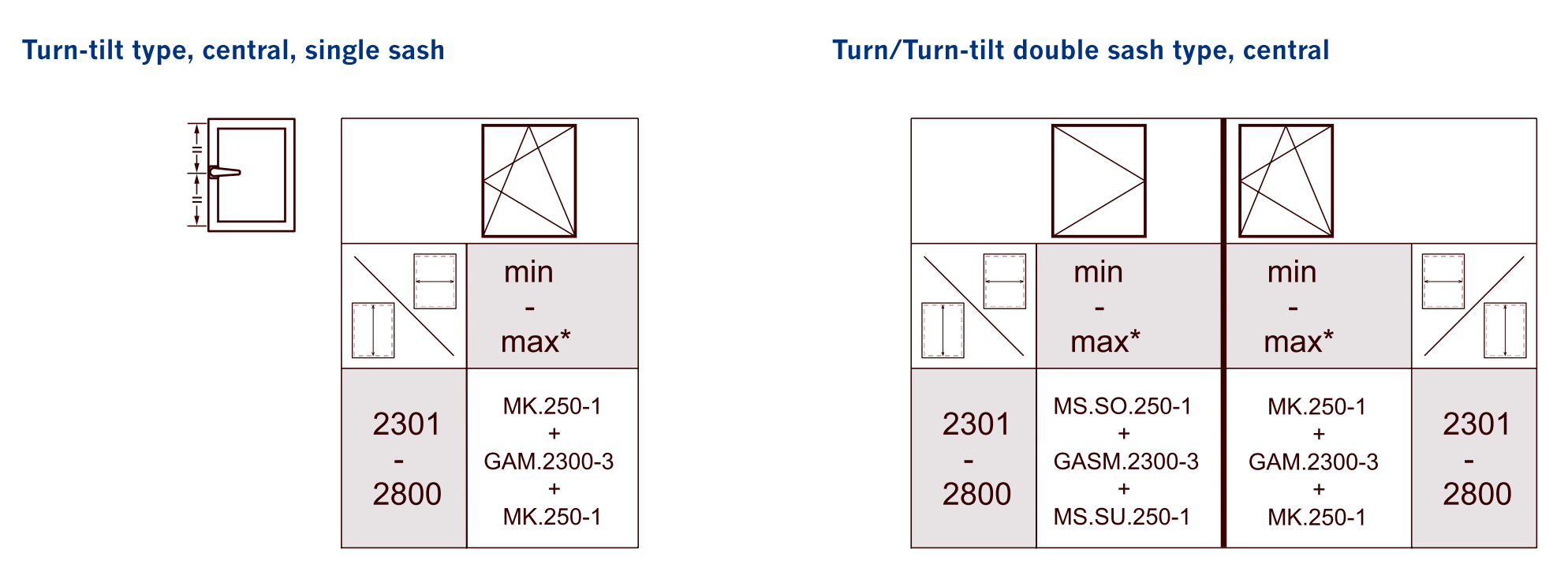 Mai jos sunt cateva diagrame cu dimensiuni minime si maxime de ferestre ce pot fi realizate cu aceasta feronerie, dar si schema de montaj pentru un sistem oscilobatant cu maner cota variabila ( pozitie centrala).
