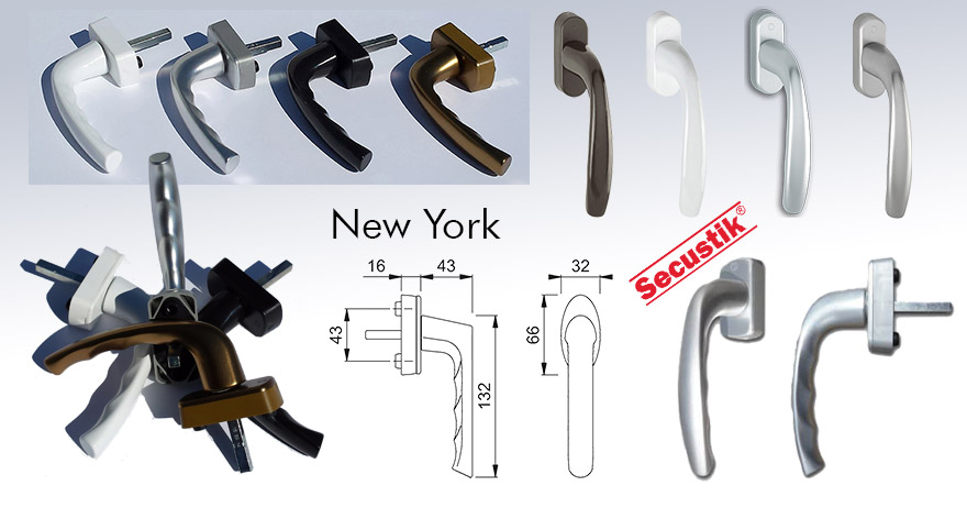 * HOPPE New York ( manere cu tehnologia Secustik): alb (9003), maro inchis (8077), argintiu (anodizat F1), bronz (anodizat F4) si titan (anodizat F9).